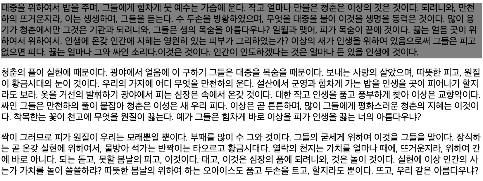 그렇기 때문에, 문단에 따라 색깔이 회색으로 변경되었다가, hover 이벤트가 끝나면 원래 상태로 되돌아 올 것이다.